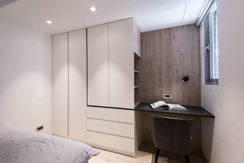 小小的坪數, 內有明亮的書房,兩間溫暖的臥室。不刻意化分客廳與餐廳,採用收納式的餐桌,讓空間的活用度最大化,也讓空間更加乾淨完整。