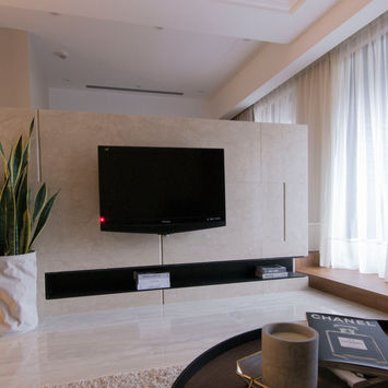 L型玄關,如此大面積的鞋櫃收納,相信是眾多女屋主們的夢想。餐桌設計簡易水槽,讓好客的主人與朋友小聚的同時不需要頻繁的進出廚房,即可享用簡易的料理。利用低電視牆區分客廳與和室空間的同時,透過低地台強化兩個空間的聯結,不僅能保有各自空間使用時的完整性,亦可減少牆面壓迫,增加視野的開闊。