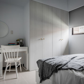 小坪數住宅常缺少可放置大容量鞋櫃的玄關空間,利用電視牆與置物櫃的結合,使客廳放大的同時,讓全家的鞋都可以有完整個收納。櫃體不做滿,保留下放通透,讓空間變的不壅擠。